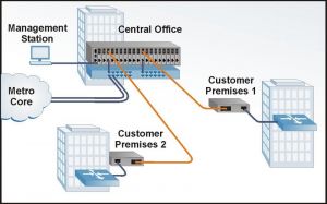 At the Central Office, the GX/TM2 plug-in module is installed in a managed iConverter 19-Module chassis for high-density fiber distribution from UTP switch equipment. At Customer Premises 1 and 2, GX/TM2 standalone NIDs provide a fiber uplink to a single copper port for intelligent demarcation of Ethernet services.