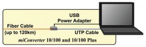 The miConverter connects to the laptop via two cables. The first cable is the USB Power Adapter which draws electrical current from the laptop's USB (1.0 or 2.0) port to power the miConverter. The other cable is the UTP cable that links the laptop network port and the miConverter copper port. The miConverter converts the UTP signal to fiber signal, which can extend up to 120km. Power from the USB port of the computer is automatically shut off when the computer is powered down, turning off the miConverter when fiber conversion is no longer needed.