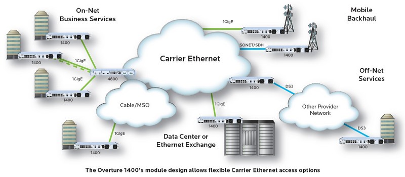 Simplified Deployment - Service providers and network operators need to provide Ethernet services to all locations, leveraging many types of network infrastructure. This includes native Ethernet over fiber or radio, or leveraging existing infrastructure such as SONET/SDH, DS3/E3 and DS1/E1. The Overture 1400 provides the flexibility to deliver Ethernet services over all these networks with one simple, modular solution. Using one platform for any network scenario reduces operational expenses for the service provider.
